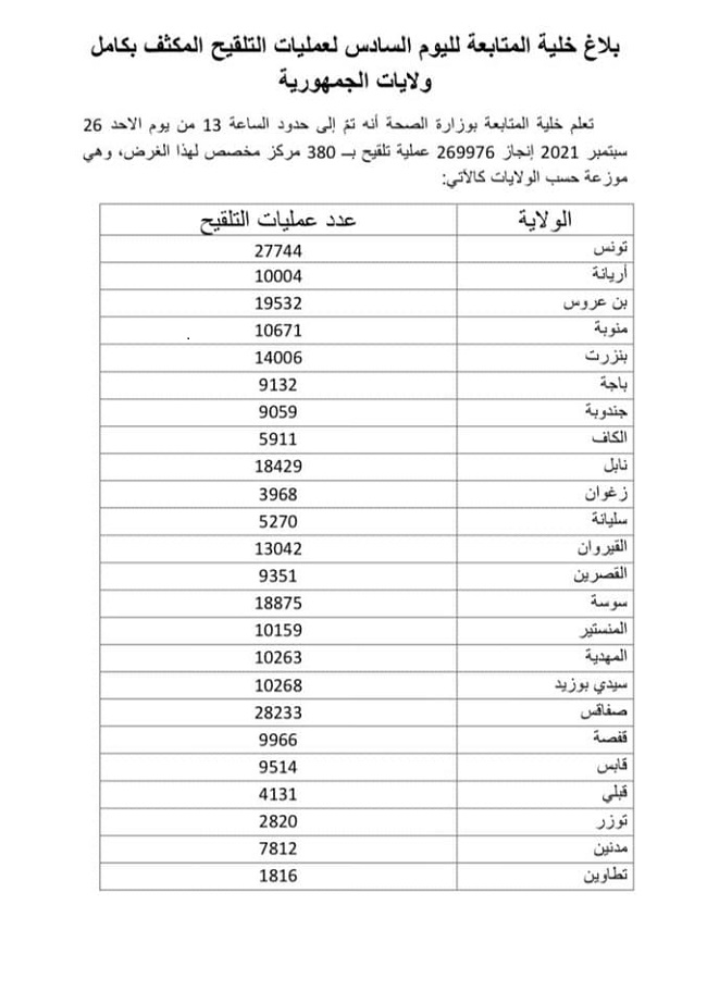 تمّ إلى حدود الساعة 17 من يوم الأحد 26 سبتمبر 2021 حسب خلية المتابعة بوزارة الصحة إنجاز 556067 عملية تلقيح بــ 380 مركز مخصص لهذا الغرض، وهي موزعة حسب الولايات كالآتي:
