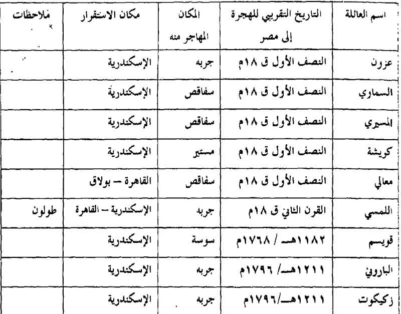 وأشار الكاتب الى أن أسماء 84 عائلة تونسية هاجرت إلى مصر ما بين القرنين الـ16 والـ18، لافتا إلى أن تواريخ هجرتهم هي تقريبية ولا يمكن الجزم بدقتها، إلا أن هذه الأسماء تعتبر «الأكثر أهمية» بين العائلات التونسية التي هاجرت إلى مصر.
