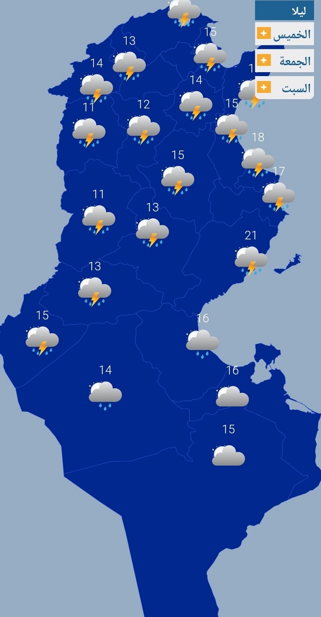 وتتراوح الحرارة ليلا بين 11 و15 درجة وتصل محليا إلى 18 بجهة الساحل وبالجنوب.
