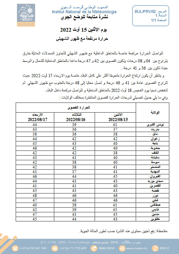 أفاد المعهد الوطني للرصد الجوي بأن درجات الحرارة تواصل ارتفاعها اليوم خاصة بالمناطق الداخلية مع ظهور الشهيلي لتتجاوز المعدلات العادية بفارق يتراوح بين 4 و8 درجات وتكون القصوى بين 42 و47 درجة، ما عدى بالمناطق الساحلية للشمال والوسط حيث تكون بين 36 و41 درجة.