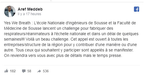 أطلق مدير المدرسة الوطنية للمهندسين بسوسة عارف مدب على صفحته على الفايسبوك تَحَدٍّ بمشاركة كلية الطب بسوسة لصنع آلات تنفس و إنعاش تحت شعار “Yes We Breath” “نعم نتنفس”.
