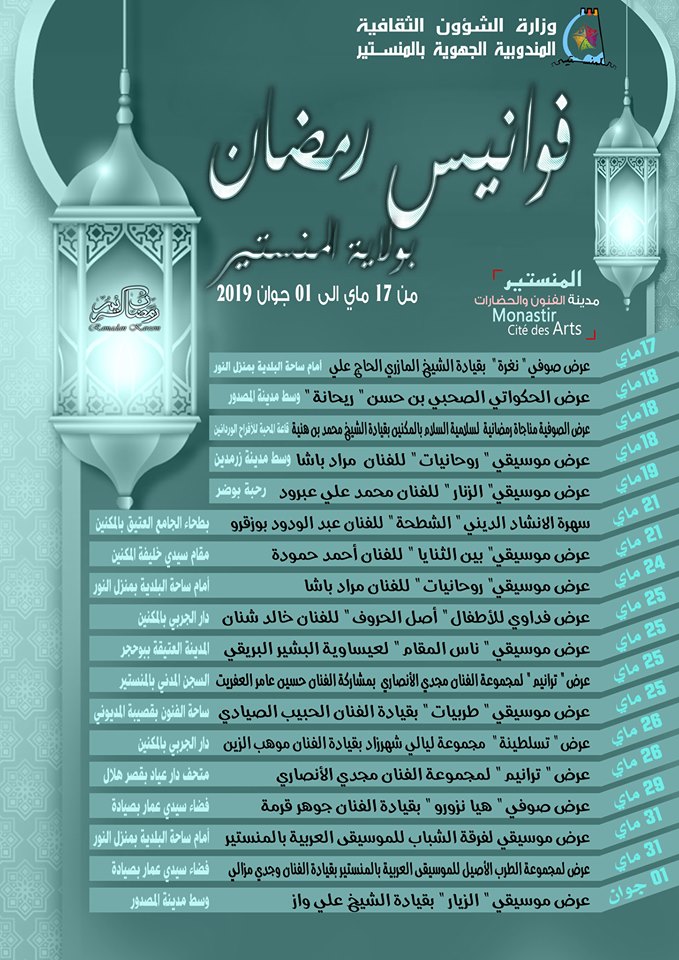 تنظم المندوبية الجهوية للثقافة بولاية المنستير تظاهرة فوانيس رمضان وذلك من 17 ماي الى 01 جوان 2019 بسهرات موسيقية رمضانية متنوعة بكامل ربوع ولاية المنستير تحت شعار: “ثقافة القرب ثقافة للجميع”.