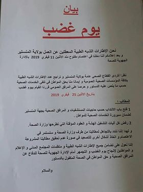 وأضاف خرولي أن ” تنظيم يوم الغضب يأتي بسبب تجاهل السلطات المعنية لمطالبنا فنحن معتصمون منذ يوم 11 فيفري الجاري وسنواصل الإعتصام فهو شكل من أشكال التصعيد وفي حال لم تتجاوب وزارة الصحة في أقرب الآجال مع مطالبنا وهي التشغيل المباشر وليس العقود الهشة فسنتخذ أشكالا تصعيدية أخرى”.