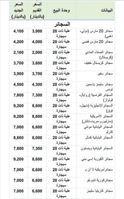 أعلنت الوكالة الوطنية للتبغ والوقيد، ومصنع التبغ بالقيروان، في بلاغ صادر عن وزارة المالية مساء الأحد 27 مارس 2022، عن تعديل بعض أسعار البيع للعموم بالنسبة للسجائر وللمواد الأخرى المختصة بها الدولة، وذلك بداية من اليوم الإثنين 28 مارس 2022.