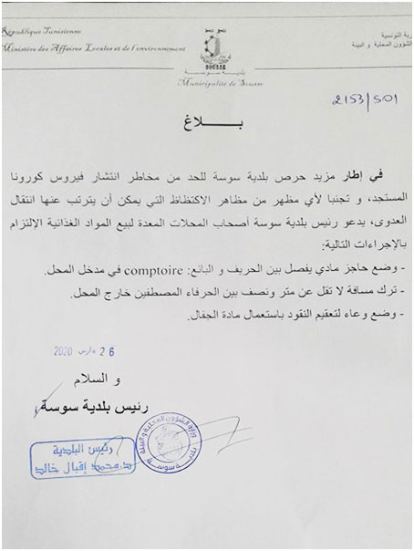 في إطار الحد من انتشار فيروس “كورونا”، دعا رئيس بلدية سوسة أصحاب المحلات المعدة لبيع المواد الغذائية إلى الالتزام بالإجراءات التالية :