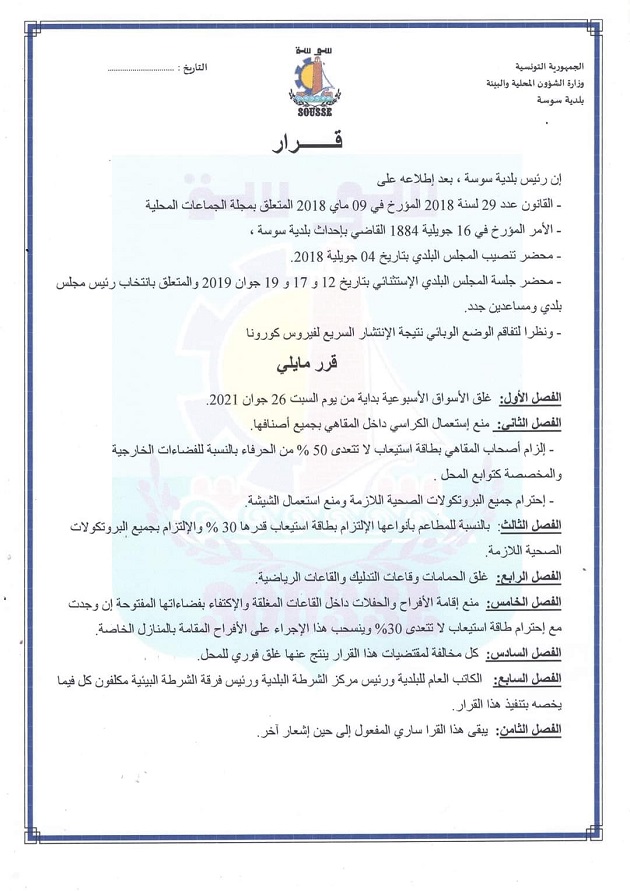 أكد رئيس بلدية سوسة محمد إقبال خالد في تصريح للجوهرة أف أم اتخاذ جملة من القرارات من بينها غلق سوق الأحد وقاعات الرياضة، وذلك على خلفية تدهور الوضع الوبائي بالجهة.