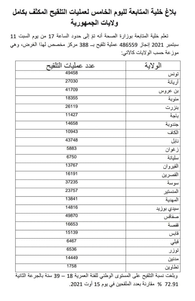 أعلنت خلية المتابعة بوزارة الصحة أنه تمّ إلى حدود الساعة 17 من يوم السبت 11 سبتمبر 2021 إنجاز 486559 عملية تلقيح ضد فيروس كورونا المستجد، في اليوم الخامس من حملة التلقيح المكثف، الذي انتظم في 388 مركز مخصص لهذا الغرض.