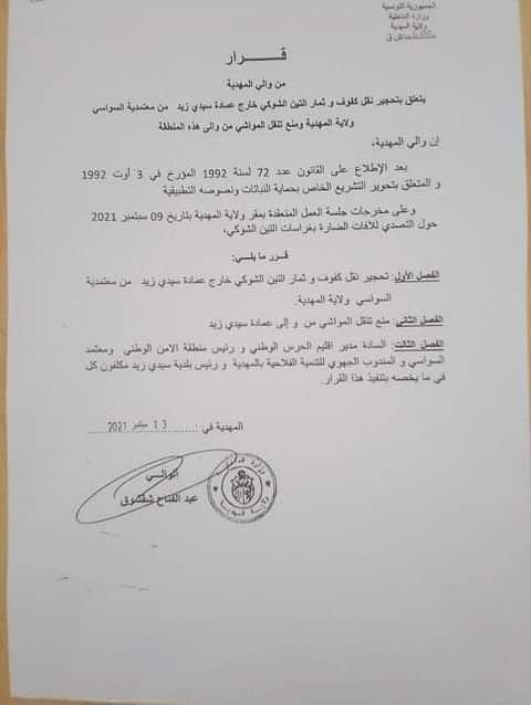 أصدر والي المهدية، عبد الفتاح شقشوق، أمس الإثنين، قرارا يقضي بمنع نقل ثمار التين الشوكي و المواشي من منطقة “سيدي زيد” التي تشهد انتشارا للحشرة القرمزية إلى مناطق أخرى.