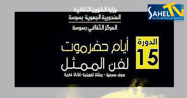 تنظم المندوبية الجهوية للشؤون الثقافية بسوسة بالتعاون مع المركز الثقافي بسوسة الدورة 15 “لأيام حضرموت لفن الممثل” وذلك في الفترة الفاصلة بين 20 و23 ديسمبر 2018.