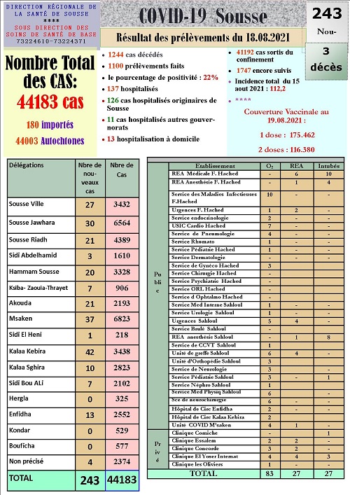 أعلنت الإدارة الجهوية للصحة بسوسة عن تسجيل 3 وفيات و243 إصابة جديدة بفيروس كورونا.