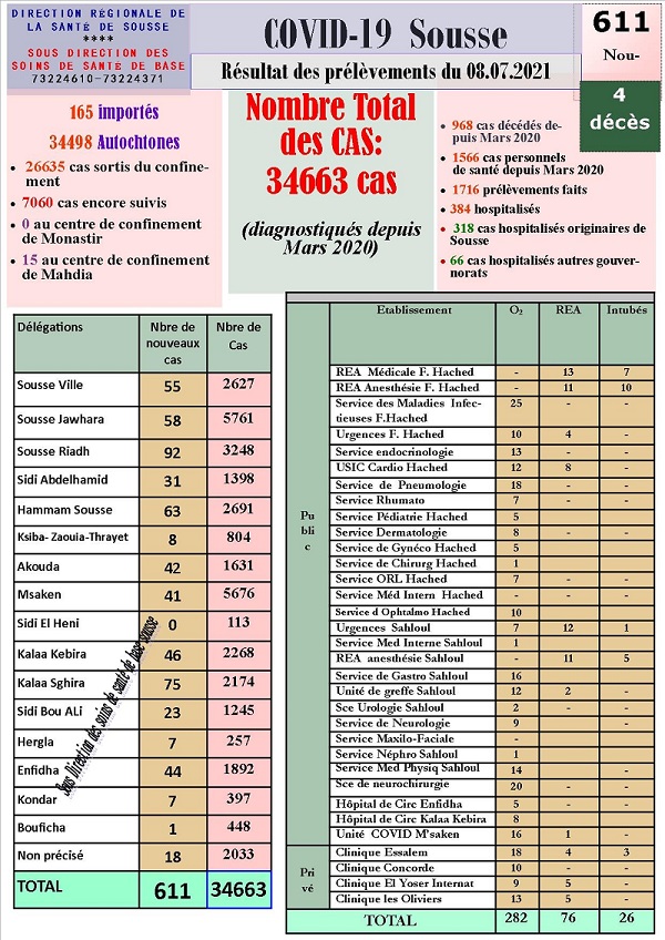وارتفع بذلك العدد الجملي للوفيات بالفيروس في الجهة، منذ بداية انتشار الوباء إلى 968 حالة وفاة والإصابات إلى 34663 إصابة.