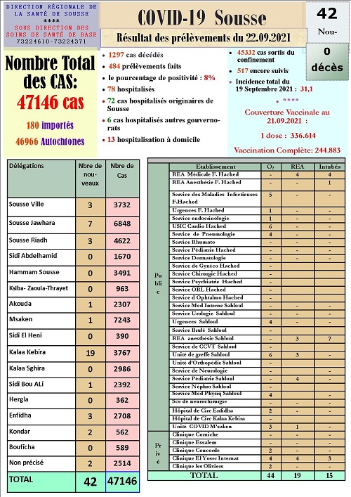 سجلت الإدارة الجهوية للصحة بسوسة بتاريخ 22 سبتمبر الحالي، 42 إصابة جديدة بفيروس كورونا ليرتفع بذلك العدد الجملي للمصابين في الجهة، منذ بداية انتشار الوباء، إلى 47146 إصابة.