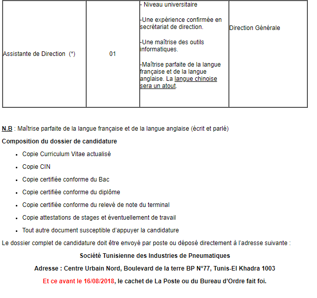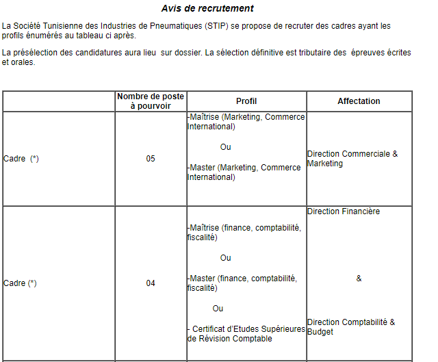 أعلنت الشركة التونسية لصناعة الإطارات المطاطية STIP عن فتح مناظرة بالملفات مشفوعة باختبارات كتابية وشفاهيه لانتداب (10 خطط) إطارات من مختلف الاختصاصات.