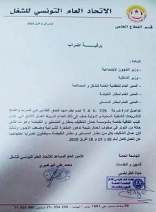 ينفّذ عملة التنظيف بمطاري المنستير والنفيضة إضرابا عن العمل يتواصل إلى غاية يوم الغد الخميس 18 أفريل 2019 .