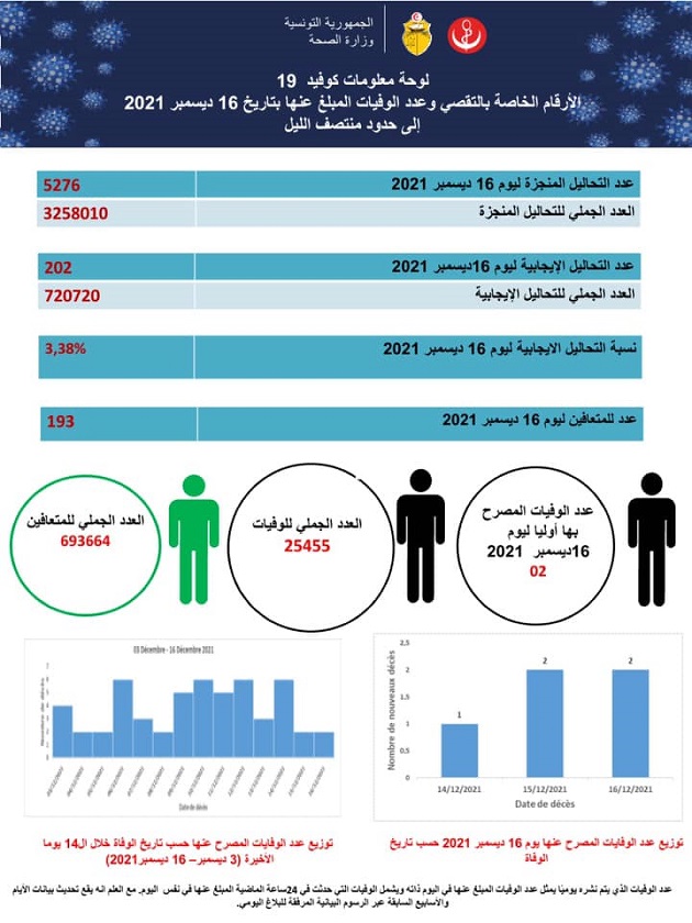 أفادت وزارة الصحة بأنه تم بتاريخ 16 ديسمبر الحالي، الإبلاغ عن تسجيل حالتي وفاة بفيروس كورونا و 202 إصابات جديدة.