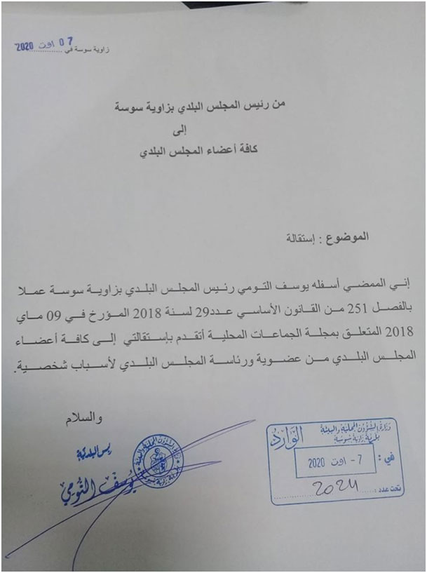 قدم رئيس المجلس البلدي بزاوية سوسة يوسف التومي الجمعة7أوت2020، إستقالته من عضوية ورئاسة البلدية لأسباب وصفها بالشخصية.