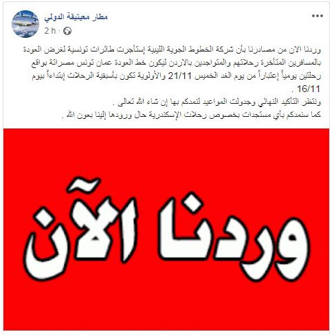 أعلنت إدارة مطار معيتيقة الدولي، أن شركة الخطوط الجوية الليبية إستأجرت طائرات تونسية لغرض العودة بالمسافرين المتأخرة رحلاتهم والمتواجدين بالأردن ليكون خط العودة عمان تونس مصراتة بواقع رحلتين يومياً ابتداءً من يوم غد الخميس 21 نوفمبر 2019.