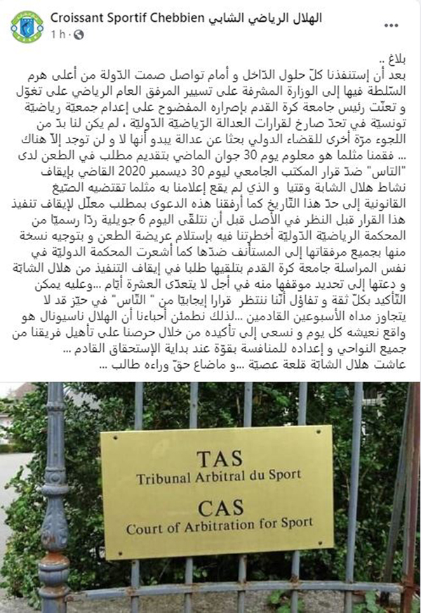 وأضاف الهلال في بلاغه أنه تلقى اليوم الثلاثاء ردّا رسميّا من المحكمة الرياضيّة الدّوليّة تم اعلامه من خلاله باستلام عريضة الطعن ضدّ قرار المكتب الجامعي ليوم 30 ديسمبر 2020 القاضي بإيقاف نشاط هلال الشابة وقتيا وبتوجيه نسخة منها بجميع مرفقاتها إلى المستأنف ضدّها كما أشعرت “التاس” نفس المراسلة جامعة كرة القدم بتلقيها طلبا في إيقاف التنفيذ من الهلال ودعتها إلى تحديد موقفها منه في اجل لا يتعدّى 10 أيام.