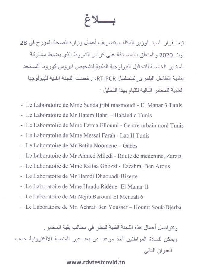 أعلنت وزارة الصحة في بيان لها، أن اللجنة الفنية للبيولوجيا رخصت لـ11 مخبرا خاصا جديدا للقيام بإختبارات تشخيص فيروس كورونا المستجد بتقنية التفاعل البلمري المتسلسل RT-PCR.