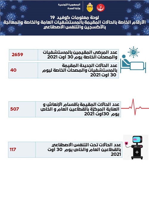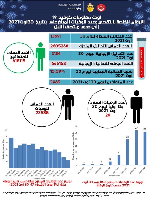 أفادت وزارة الصحة بأن عدد الوفيات جراء فيروس كورونا المصرّح بها بتاريخ 30 أوت 2021، بلغ 26 حالة وفاة مع تسجيل 2134 إصابة جديدة.