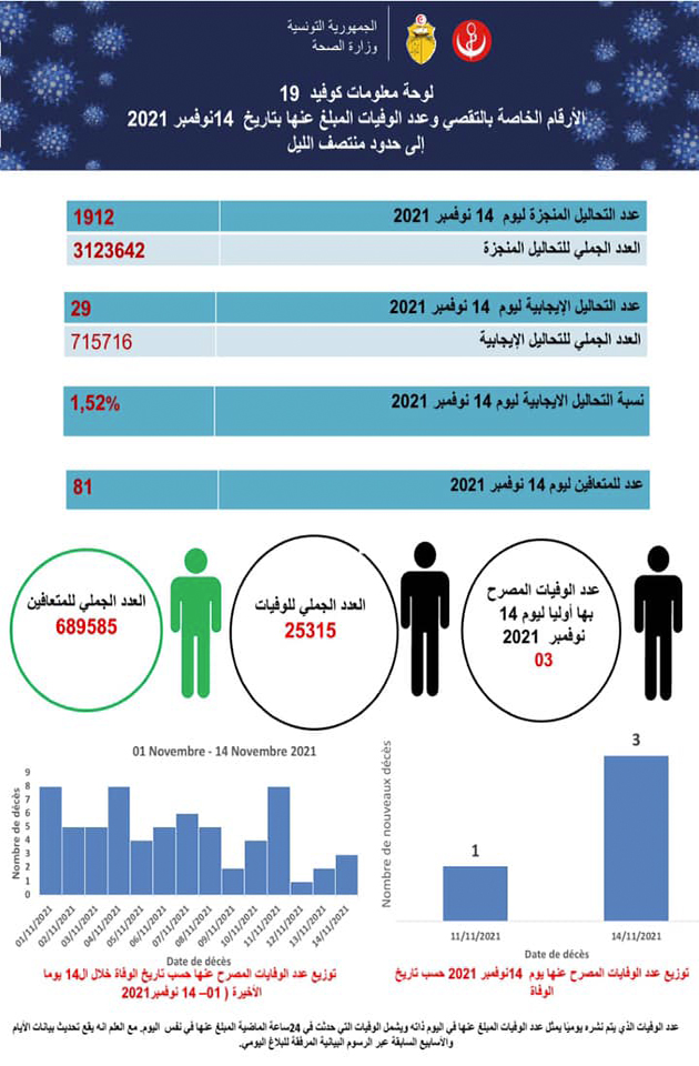 أعلنت اليوم الإثنين 15 نوفمبر 2021 ، وزارةُ الصحة، في بلاغها اليومي حول الوضع الوبائـــي عن تسجيل 3 حالات وفاة جديدة ناجمة عن الاصابة بفيروس كورونا و 29 إصابة بالفيروس وذلك بعد إجراء1912 تحليلا مخبريا بتاريخ الــ14 من نوفمبر الحالي لتبلغ نسبة التحاليل الإيجابية 1.52 بالمائة.