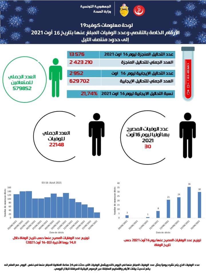 أعلنت وزارة الصحة أنه تم بتاريخ 16 أوت الحالي، تسجيل 30 حالة وفاة و2952 إصابة بفيروس كورونا.